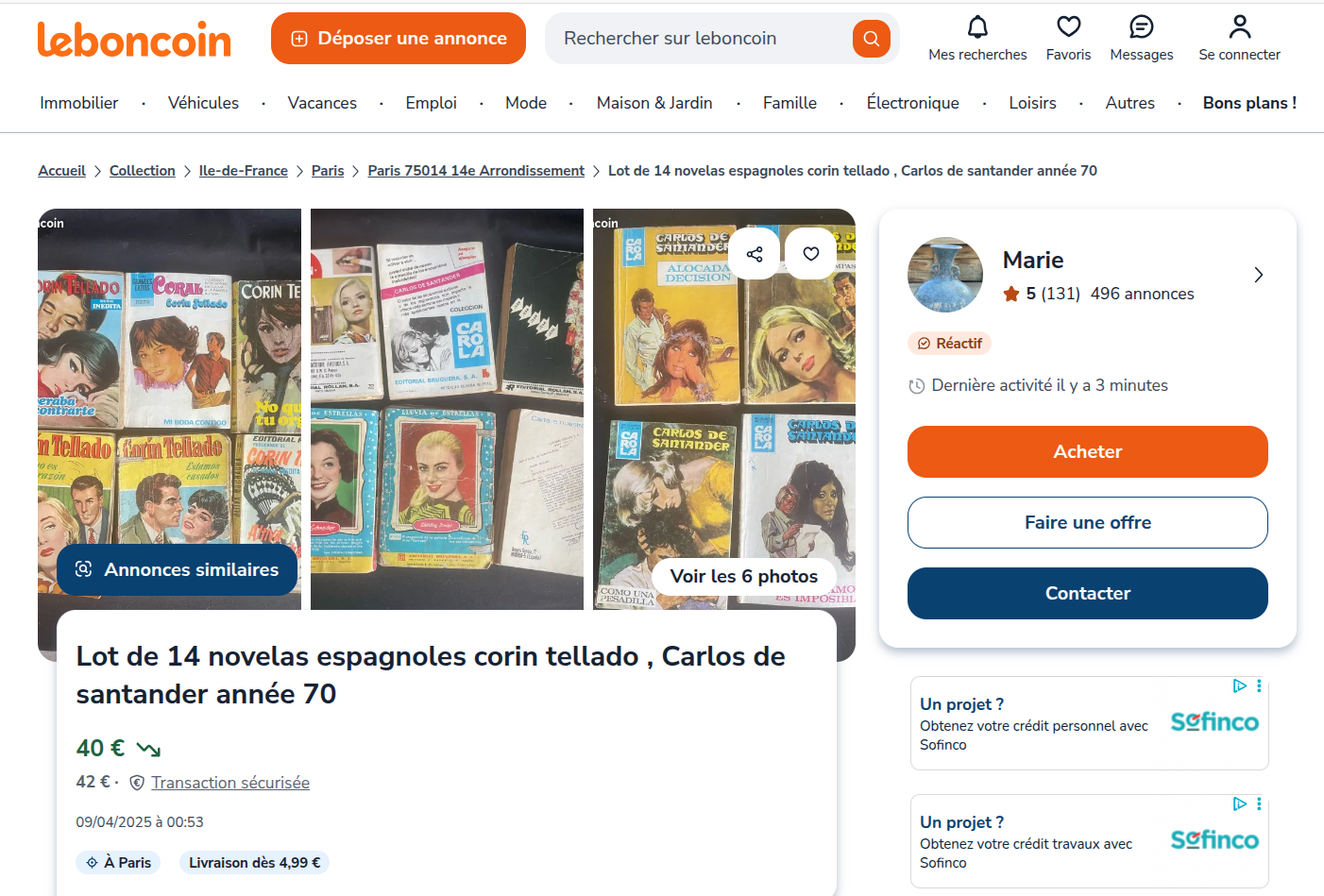Bloqueo escritural. Me vino luego de hablar con Ariadna, mi colega mexicana que dejó la universidad el año pasado para trabajar en un liceo en Versailles, no dejo de pensar en la verosimilitud. Desidia. Para procrastinar me pongo a buscar las novelas de Corin Tellado, porque debe haber ejemplares antiguos por aquí. Voy al sitio de avisos de Le Bon Coin y me sale que en París una tal Marie tiene un lote, por 40 euros. Quizás deba aprovechar de ir después del trabajo.
